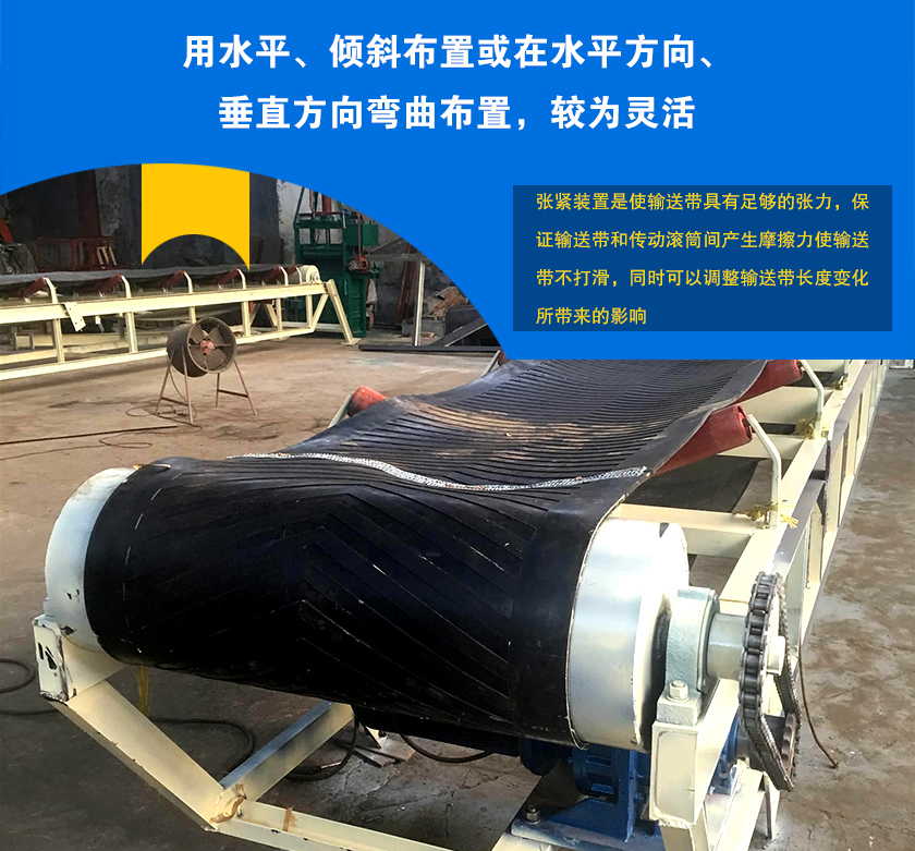 3、張緊裝置是使輸送帶具有足夠的張力,保證輸送帶和傳動滾筒間產(chǎn)生摩擦力使輸送帶不打滑,同時可以調(diào)整輸送帶長度變化所帶來的影響