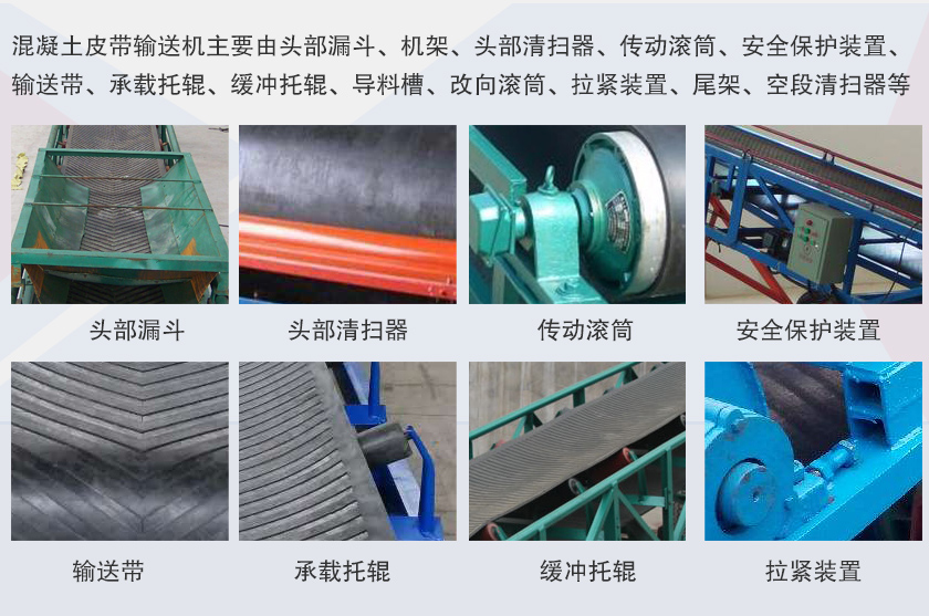 混凝土皮帶輸送機(jī)主要由頭部漏斗、機(jī)架、頭部清掃器、傳動滾筒、安全保護(hù)裝置、輸送帶、承載托輥、緩沖托輥、導(dǎo)料槽、改向滾筒、拉緊裝置、尾架、空段清掃器等部分組成。