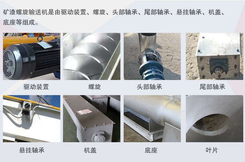 礦渣螺旋輸送機(jī)是由驅(qū)動(dòng)裝置、螺旋、頭部軸承、尾部軸承、懸掛軸承、機(jī)蓋、底座等組成。驅(qū)動(dòng)裝置:由電動(dòng)機(jī)、減速器、聯(lián)軸器等組成。螺旋軸與吊軸承、頭部軸承、尾部軸承聯(lián)接采用嵌入舌式,安裝拆卸不需軸向移動(dòng),維修方便,采用變徑結(jié)構(gòu),增大吊軸承處的容積,避免吊軸承與物料接觸,各傳動(dòng)部位采用浮動(dòng)聯(lián)接方式,頭尾軸承座均在殼體外,所有軸承采用多層密封和配合密封技術(shù),軸承使用壽命長。