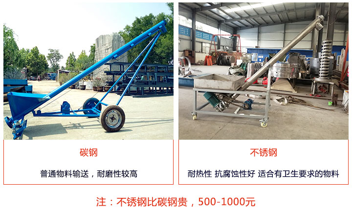 移動螺旋輸送機分為碳鋼和不銹鋼兩種,同一型號下,碳鋼材質(zhì)的移動螺旋輸送機會比不銹鋼材質(zhì)的便宜500-1000元。