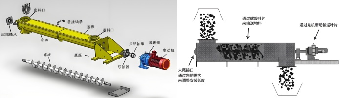 簡單來說,其過程可以理解為:旋轉葉片 → 推動物料 → 物料沿軸向前進 → 連續(xù)排出。當輸送機水平布置時,主要依靠葉片的機械推力;當傾斜或垂直布置時,還需克服部分重力影響,因此輸送效率會有所變化。