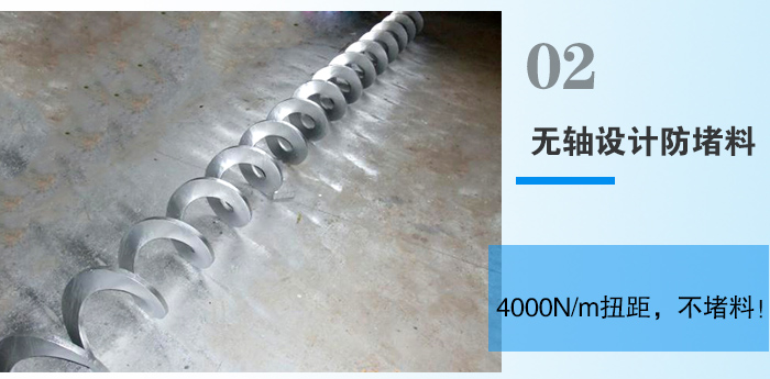 無軸螺旋輸送機其扭距可達4000N/m,所以物料不易堵塞,排料口也出現(xiàn)不堵塞,因而可以降低螺旋機的運轉速度使其平穩(wěn)傳動,從而達到降低能耗的效果。無軸螺旋輸送機輸送量大,輸送量是相同直徑傳統(tǒng)有軸螺旋輸送機的1.5倍。