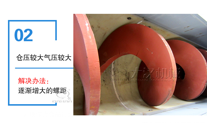 沖料原因2:倉壓較大氣壓較大,粉料沿賺旋葉片螺旋方向沖向出料口,使得喂料機在喂料處被物料“淹沒”。