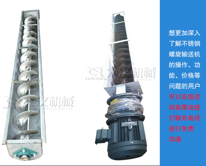 以上就是大漢小編為您介紹的輸送葡萄干所用的不銹鋼螺旋輸送機(jī),想更加深入了解不銹鋼螺旋輸送機(jī)的操作、功能、價(jià)格等問(wèn)題的用戶(hù)可以在線(xiàn)咨詢(xún)客服或撥打聯(lián)系電話(huà)進(jìn)行免費(fèi)溝通。