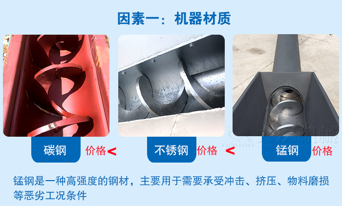 無(wú)軸螺旋輸送機(jī)的材質(zhì)主要有:碳鋼、不銹鋼、錳鋼等三種,其價(jià)格高低為:碳鋼<不銹鋼<錳鋼,其中錳鋼是一種高強(qiáng)度的鋼材,主要用于需要承受沖擊、擠壓、物料磨損等惡劣工況條件,所以價(jià)格相比其他材質(zhì)會(huì)好一些。