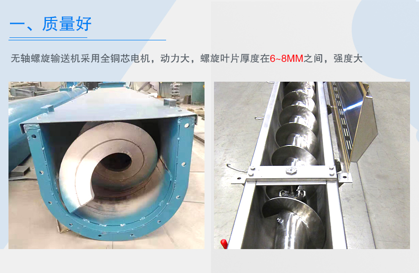 無軸螺旋輸送機采用無軸螺旋葉片,是輸送粘性高、易于纏繞的物料時輸送設備,無軸螺旋輸送機廠家有很多,哪家生產(chǎn)的無軸螺旋輸送機質(zhì)量好呢?